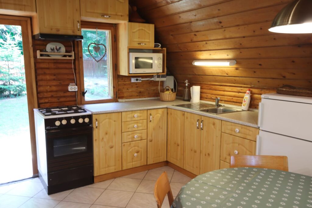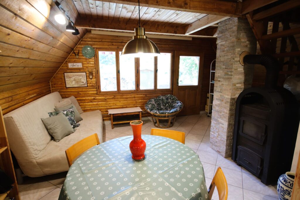 A nappali-konyhában 4 személyes étkezőasztal és kinyitható kanapé található.