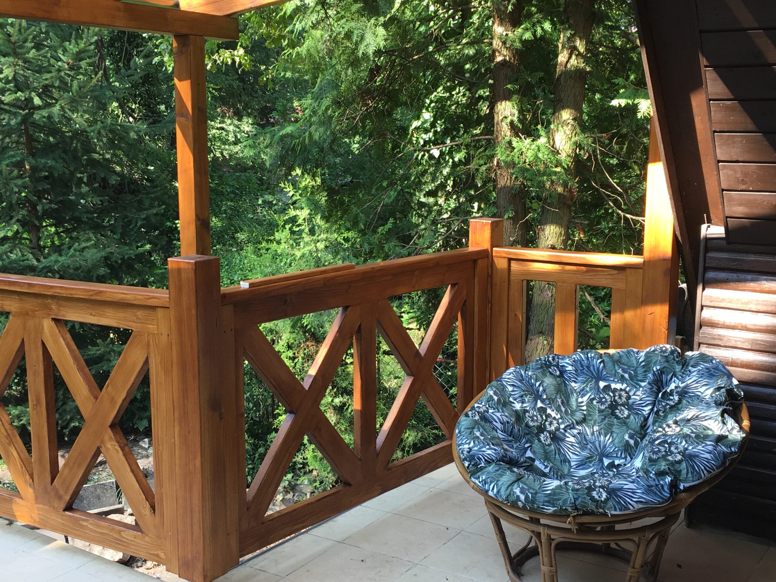 Fedett teraszunkon 6 személyes étkezőasztal, pihenő pad és napágy található.